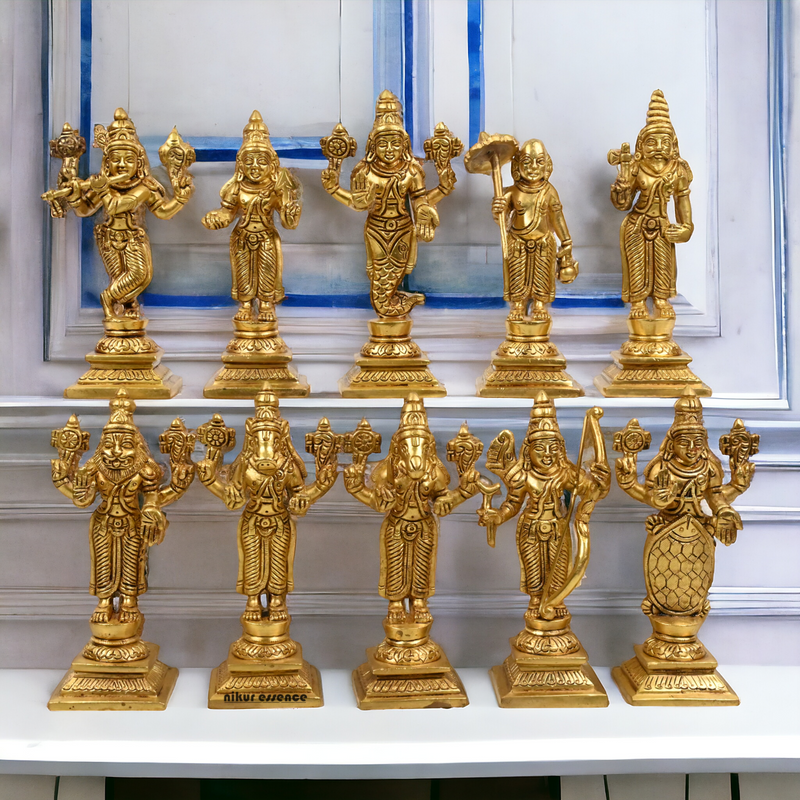Brass Dashavatara idols represent the ten divine incarnations of Lord Vishnu — Matsya, Kurma, Varaha, Narasimha, Vamana, Parashurama, Rama, Krishna, Buddha, and Kalki. Each avatar symbolizes the triumph of good over evil and the preservation of cosmic balance. Handcrafted in premium brass with intricate detailing, these idols beautifully depict each divine form with authenticity and grace. Ideal for home temples, vastu setups, or gifting, the Dashavatara set brings protection, wisdom, prosperity, and spiritual harmony into your home.