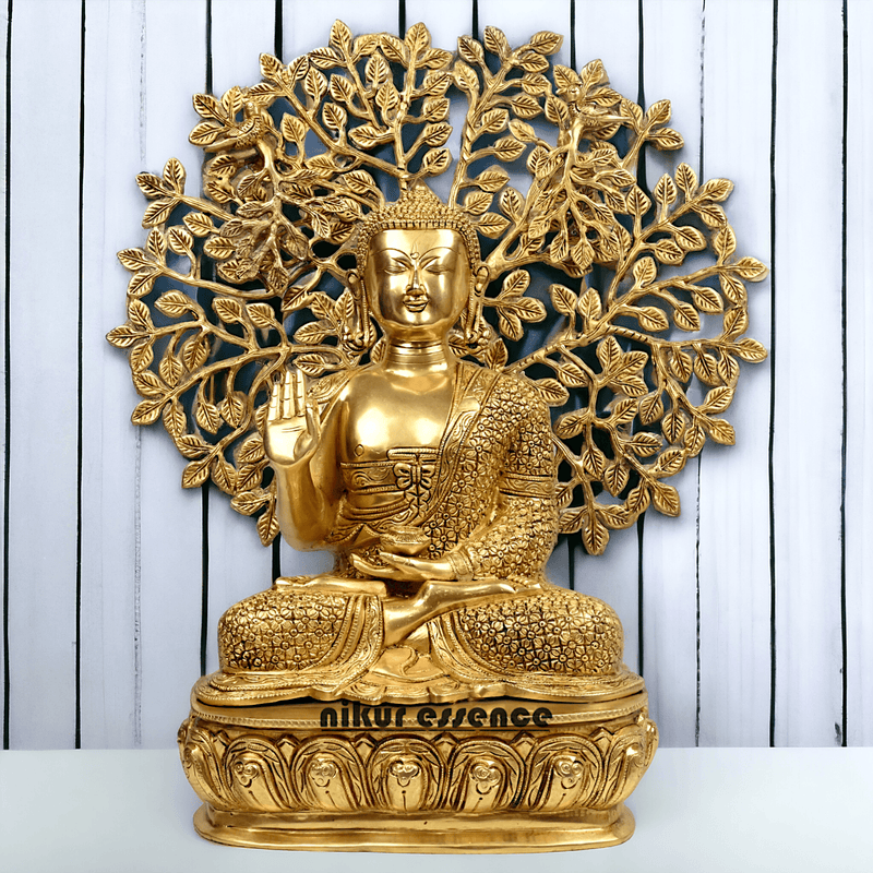 Brass Buddha Statue with Intricately Detailed Tree - nikuressence