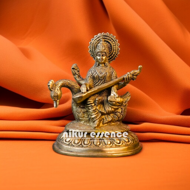 Goddess Saraswati Maa Playing Veena Seated on swan Brass idol - 6.5 Inches