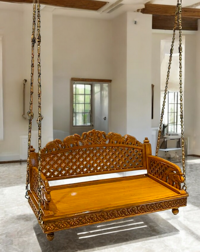 Handcrafted Teakwood Jhula – 4ft Traditional Wooden Swing with 7 feet Brass Chains with Elephant & Peacock Motifs-Nikur Essence