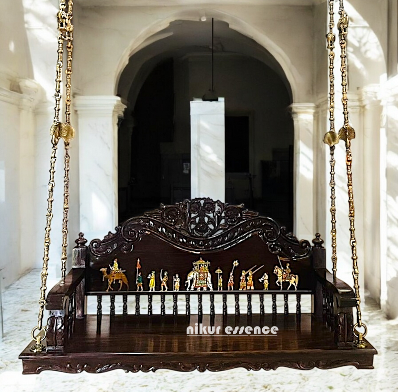 Handcrafted Wooden Oonjal (Jhula/Swing) – 5ft Royal Wooden Swing with Brass Chains & Traditional Inlay Work