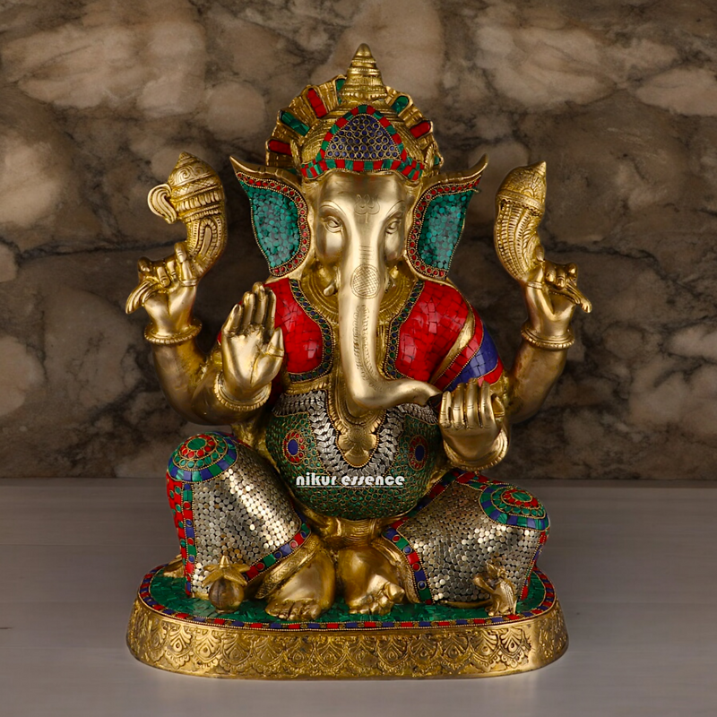 Large Ganesh Ganpati Sitting Brass beautiful Idol with Stone Work - 22 inches