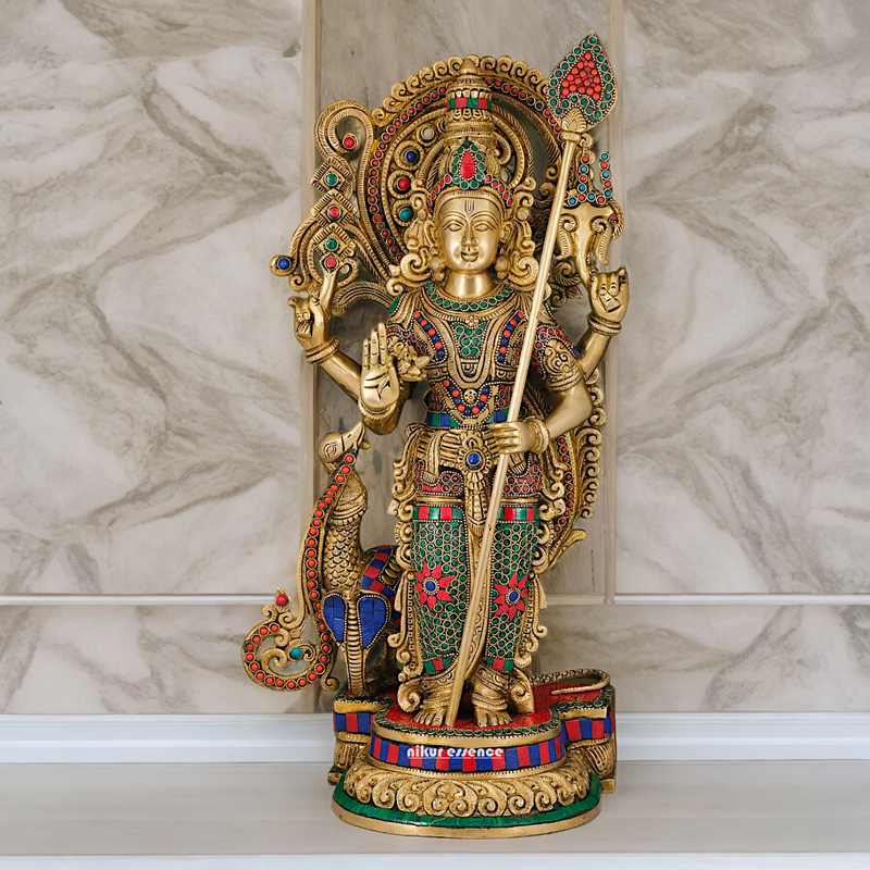 Large Kartikeya Murugan Standing Brass Idol with Stone Work - 20 inches