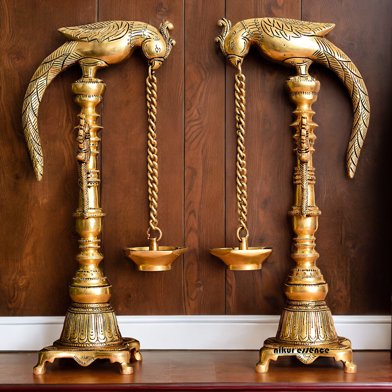 Solid Brass Pair Peacock Hanging Diya with Stand - 17 inch